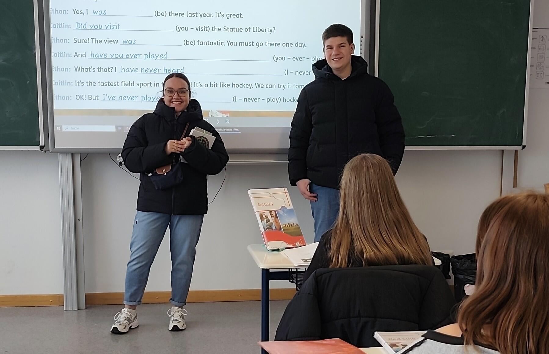 Im Rahmen ihres Besuchs traf Shivani nicht nur ihre ehemaligen Lehrkräfte an der Wirtschaftsschule wieder, sondern besuchte auch mehrere Klassen. Davon durften die Schülerinnen und Schüler der Klassen 5a, 7a und 10b profitieren: Sie hatten die Gelegenheit, Shivani und Max Fragen zu stellen und mit ihnen über ihren Alltag in London ins Gespräch zu kommen – selbstverständlich auf Englisch.