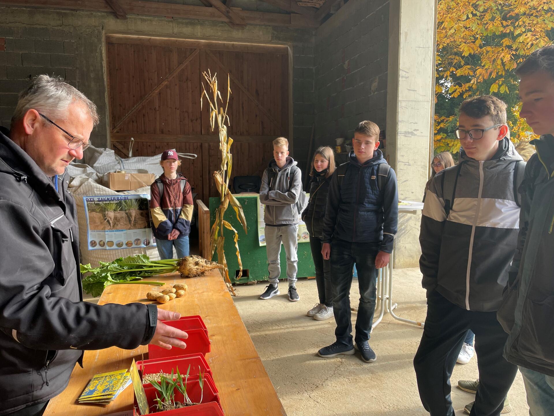 Johannes‘ Vater, Markus Martin, gab Einblicke in die weiteren Arbeitsfelder der Familie, unter anderem den Anbau von Kartoffeln, Getreide und Zuckerrüben. Seine Ausführungen verdeutlichten den Schülerinnen und Schülern auf anschauliche Art und Weise, wie sehr die Tätigkeit eines Landwirts von unternehmerischem Denken und Handeln geprägt ist und welche Wechselbeziehungen zu den verarbeitenden Betrieben bestehen.