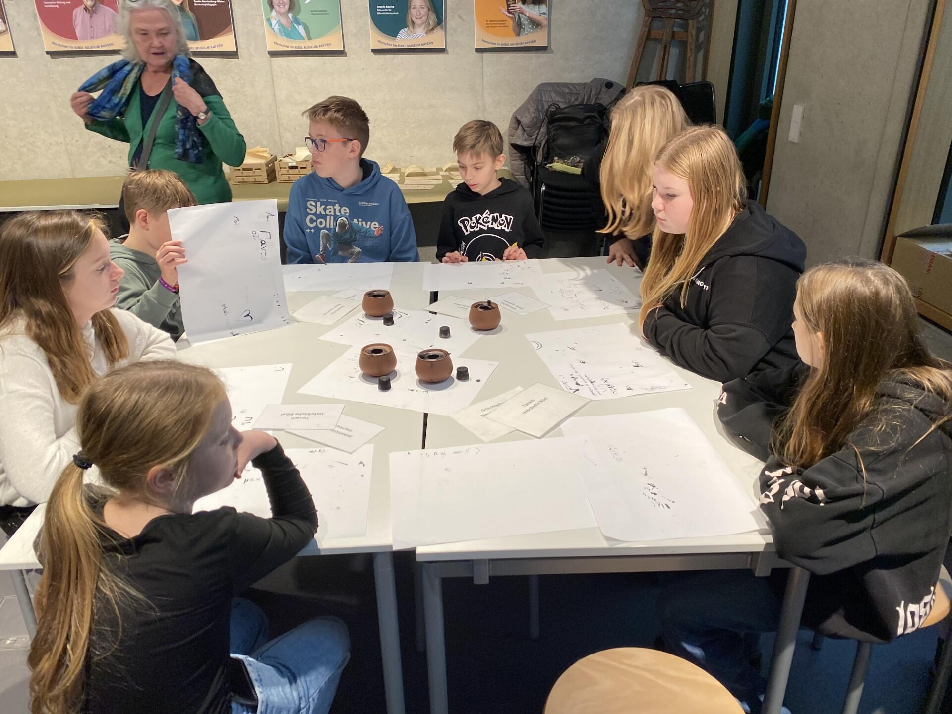 Zum Abschluss konnten die Schülerinnen und Schüler im Workshop "Schreibwerkstatt" selbst aktiv werden: Sie durften mit Tinte und einem Holzgriffel entweder einen hebräischen Text auf Pergamentpapier oder einen griechischen Text auf Papyrus schreiben. So erfuhren sie selbst, wie schwierig es ist, auf diesen Materialien schön und fehlerfrei zu schreiben.