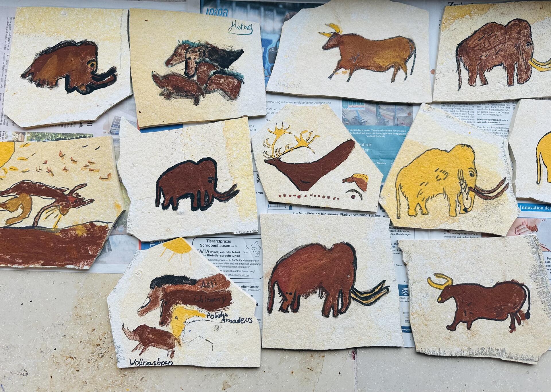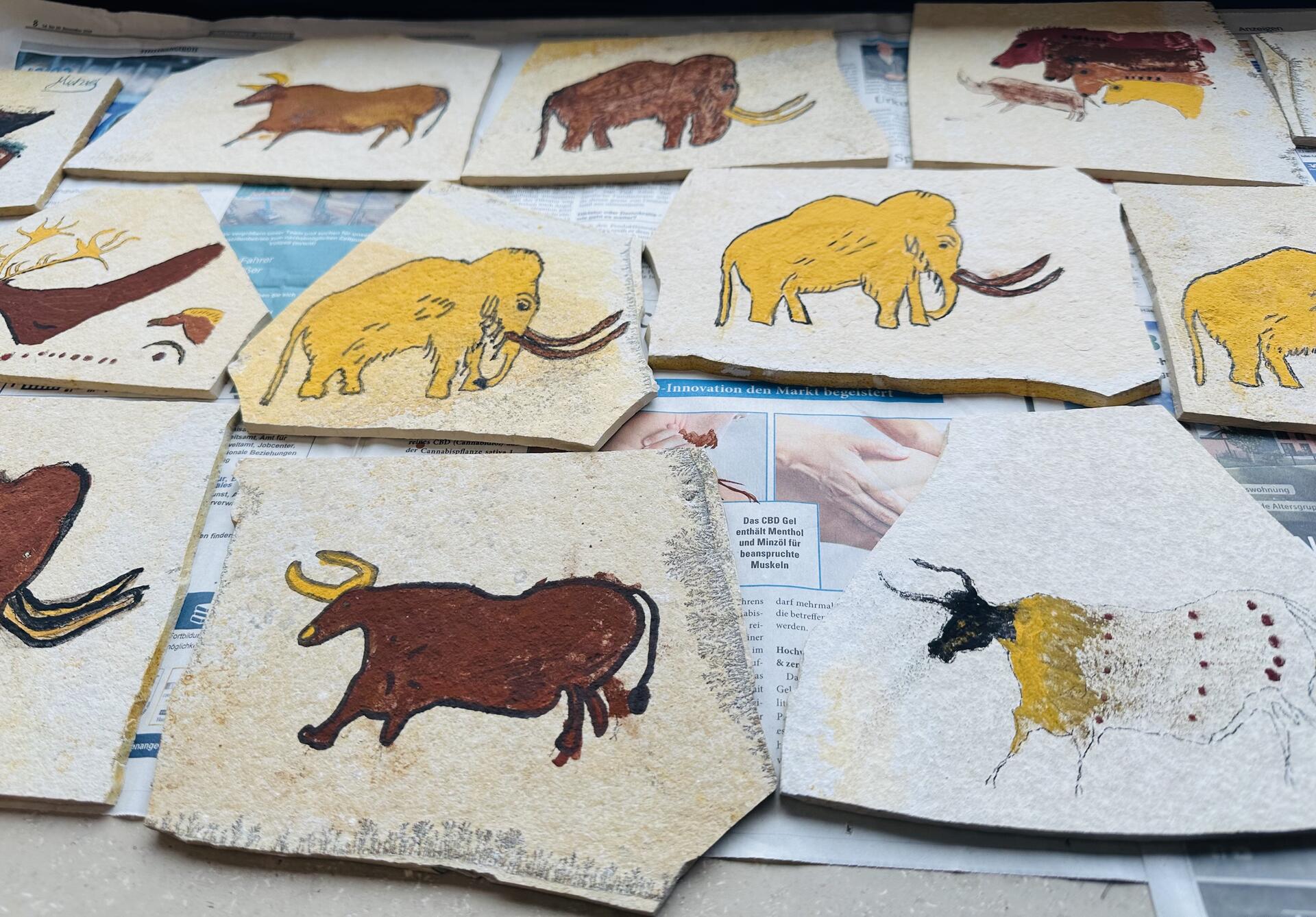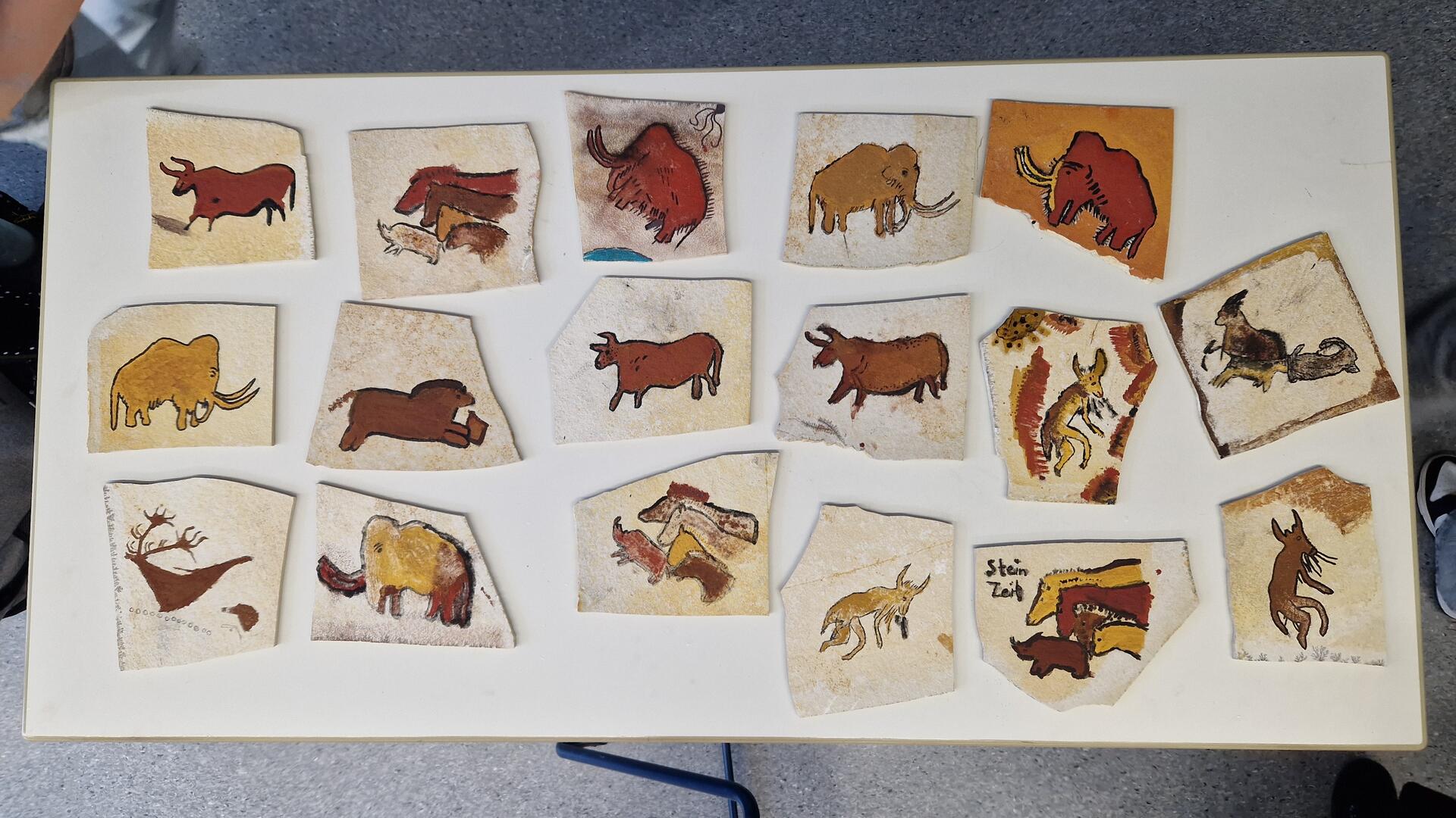 Unsere Schülerinnen und Schüler erhielten im Unterricht Steinbruchplatten, Malvorlagen mit Motiven aus der berühmten Höhle im französischen Lascaux und Farben basierend auf Erdpigmenten. Durchschlagpapier ermöglichte das Übertragen der Umrisse der Malvorlagen auf den Stein. Anschließend konnten die Jugendlichen ihre Motive farbig gestalten. Das Ergebnis kann sich in jedem Fall sehen lassen!