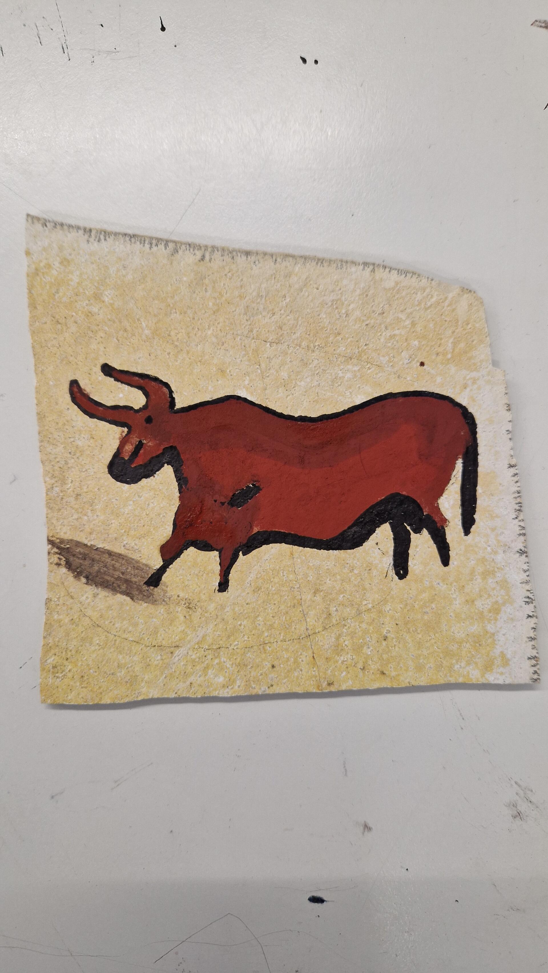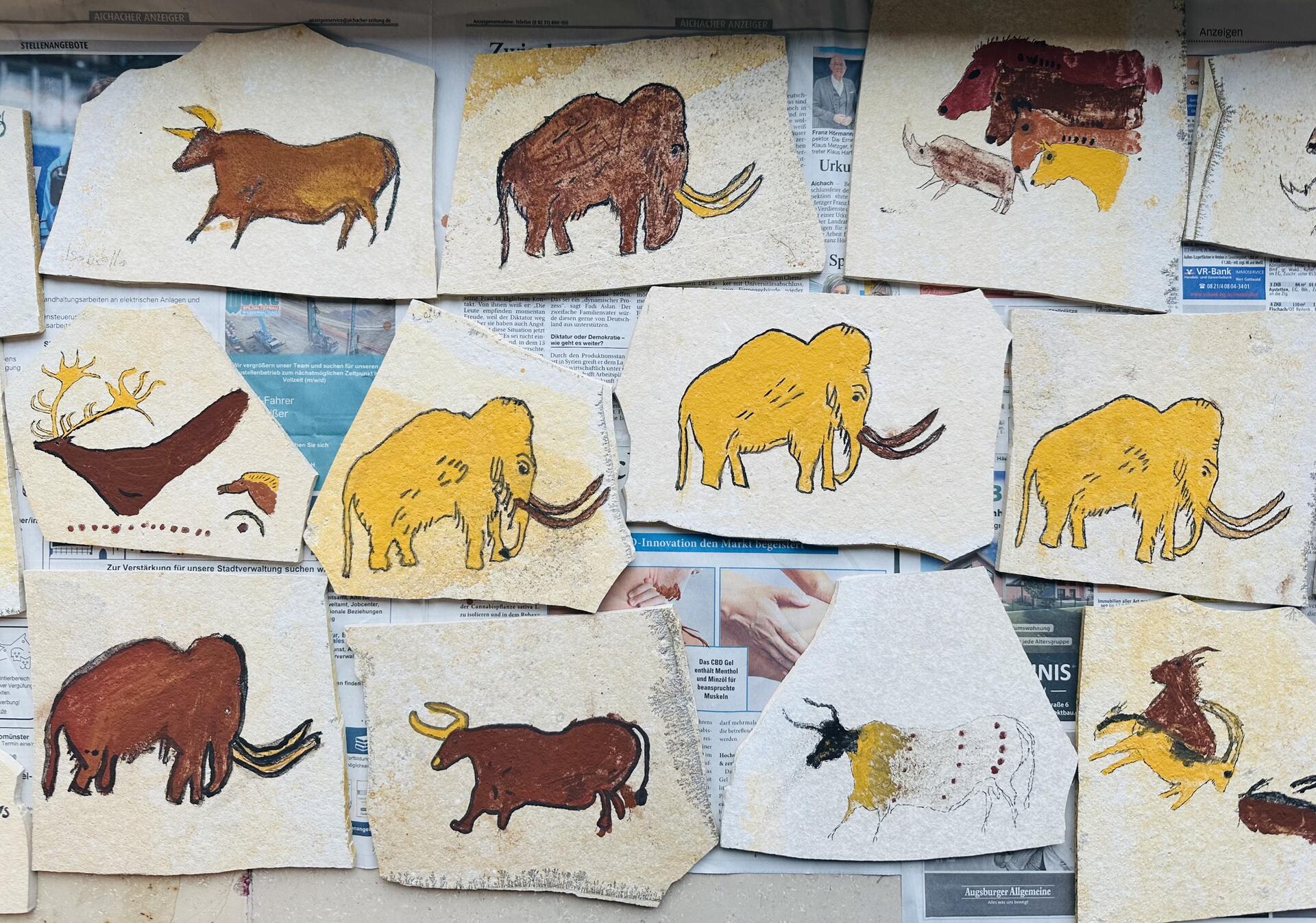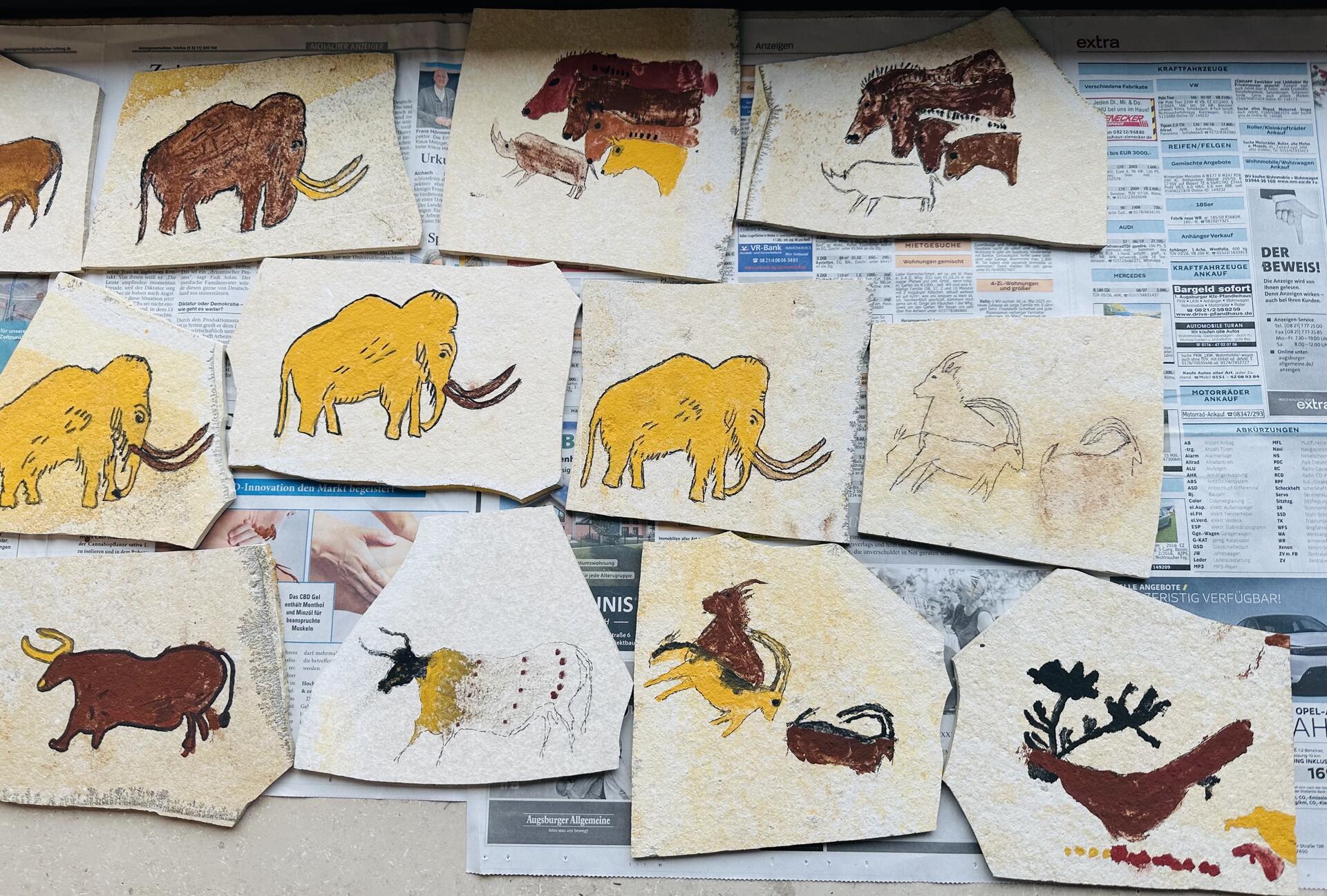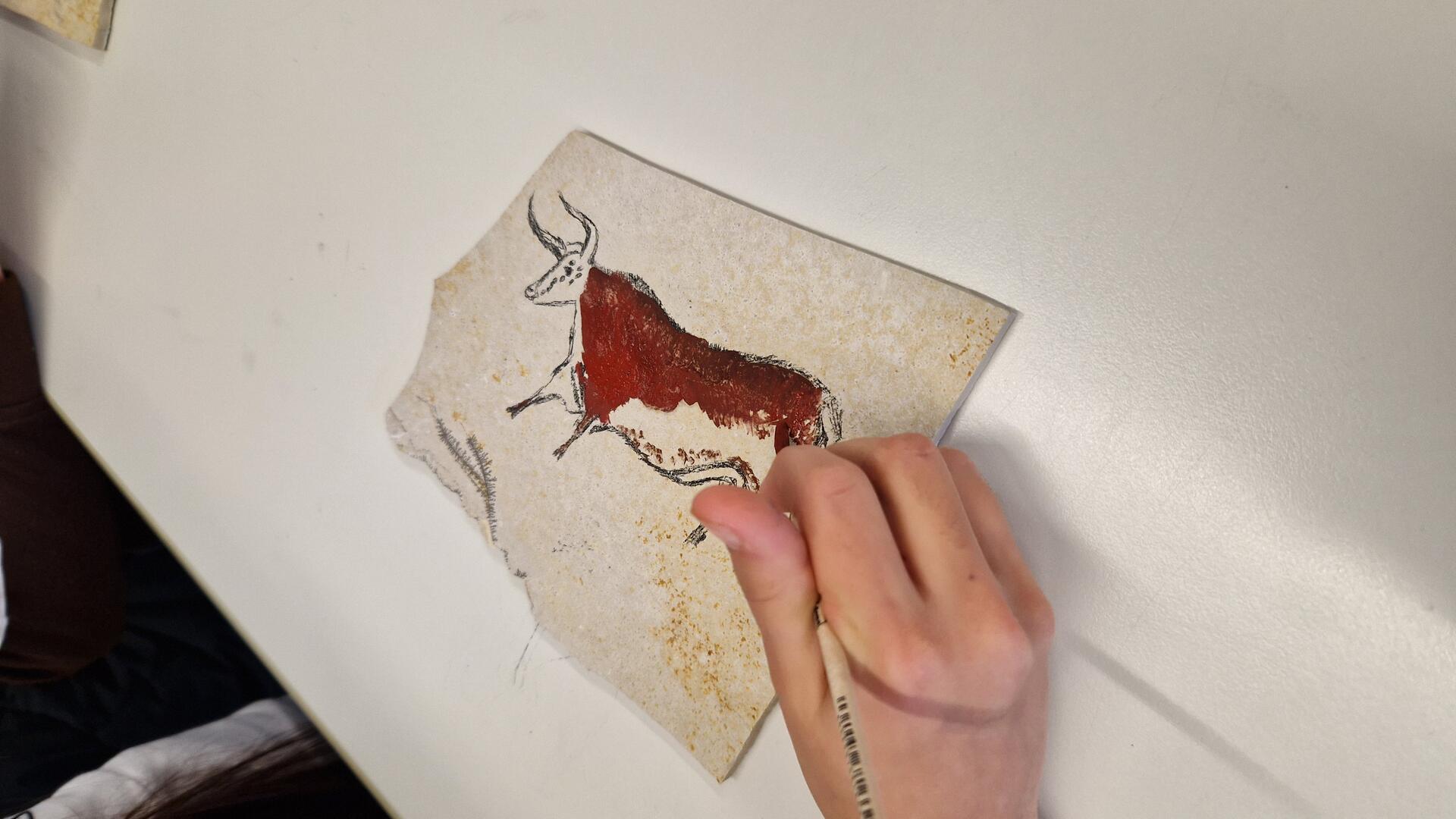 Unsere Schülerinnen und Schüler erhielten im Unterricht Steinbruchplatten, Malvorlagen mit Motiven aus der berühmten Höhle im französischen Lascaux und Farben basierend auf Erdpigmenten. Durchschlagpapier ermöglichte das Übertragen der Umrisse der Malvorlagen auf den Stein. Anschließend konnten die Jugendlichen ihre Motive farbig gestalten. Das Ergebnis kann sich in jedem Fall sehen lassen!