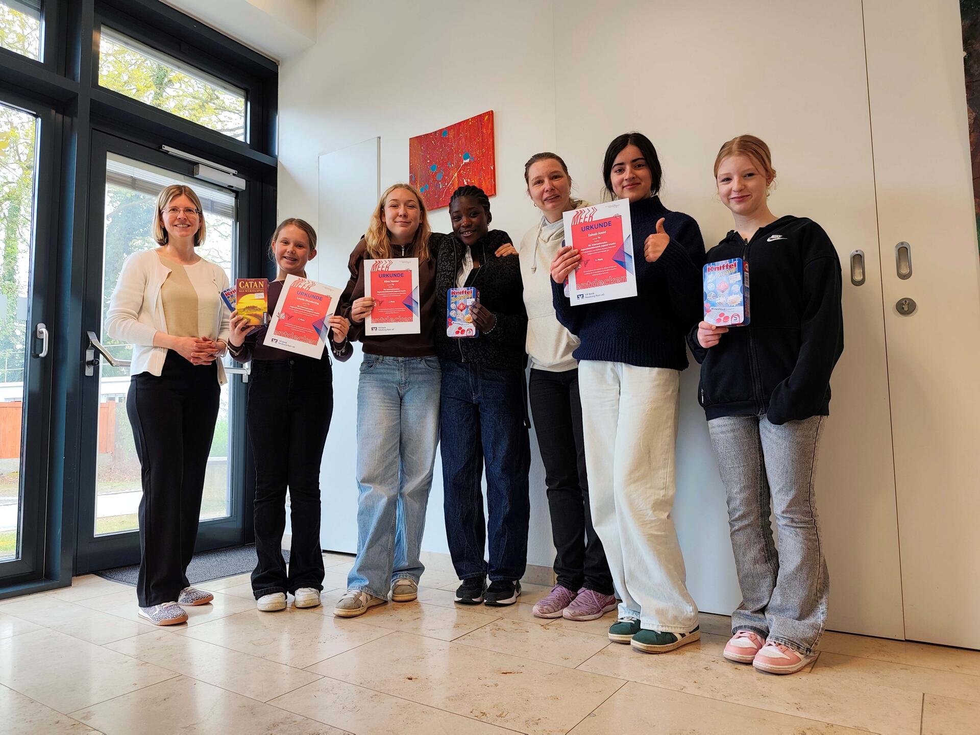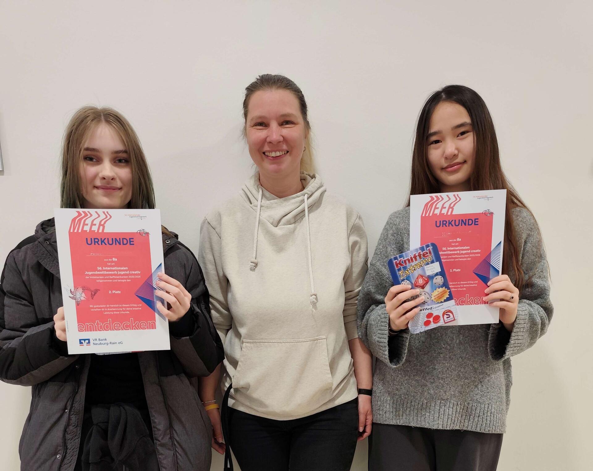 Im weiteren Verlauf des Wettbewerbs wurden die Werke dreier Schülerinnen aus der siebten Jahrgangsstufe sowie zweier Schülerinnen aus der achten Jahrgangsstufe ausgezeichnet. Alle fünf Schülerinnen durften sich über eine Urkunde sowie Preise (Spiele) freuen, die von der VR Bank Neuburg-Rain zur Verfügung gestellt wurden.